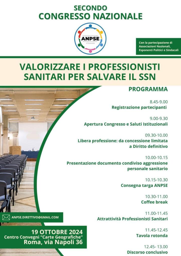 siamo lieti di invitarvi al Secondo Congresso ANPSE che si terrà a Roma sabato 19 ottobre 2024 presso il Centro Convegni sito in via Napoli 36 dalle ore 9 alle ore 13.